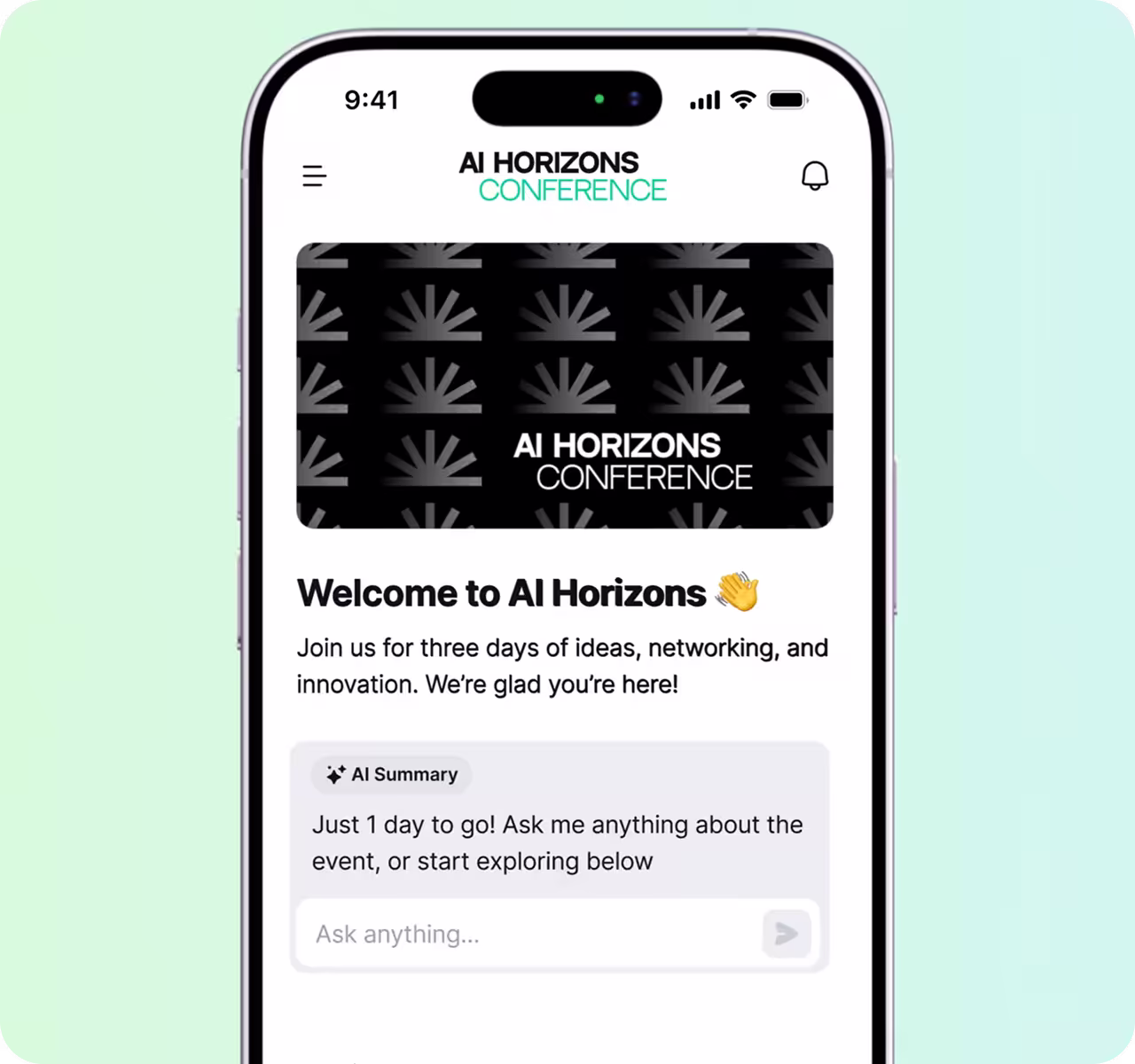 Core event app features, plus an AI that answers attendee questions 24/7 and recommends who to meet. Build in 45 min, launch same day, for $2,500 flat.