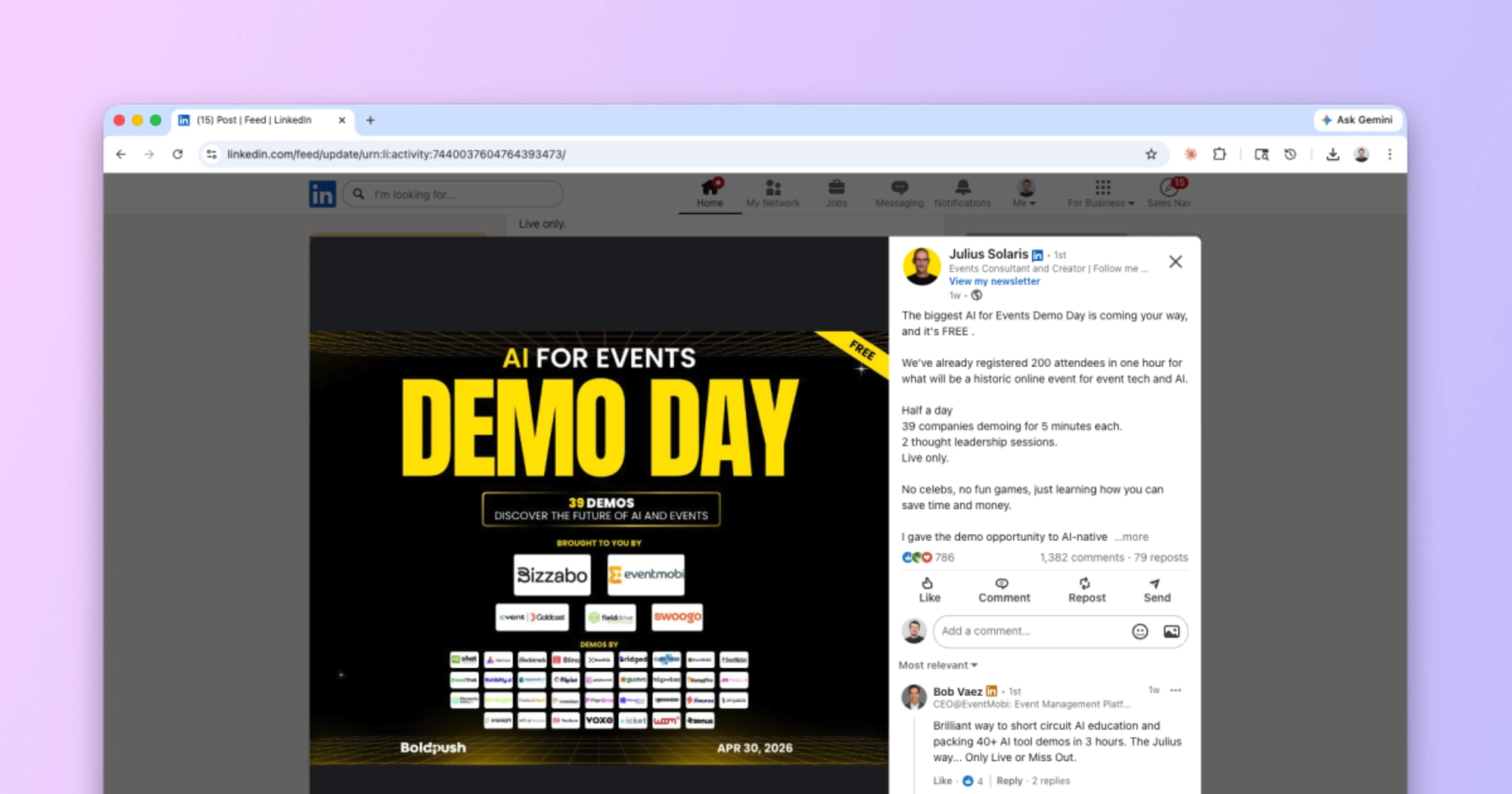 On April 30, Julius Solaris and the BoldPush team are hosting the biggest AI for Events Demo Day ever. 39 companies, 5 minutes each, half a day, free, live only.