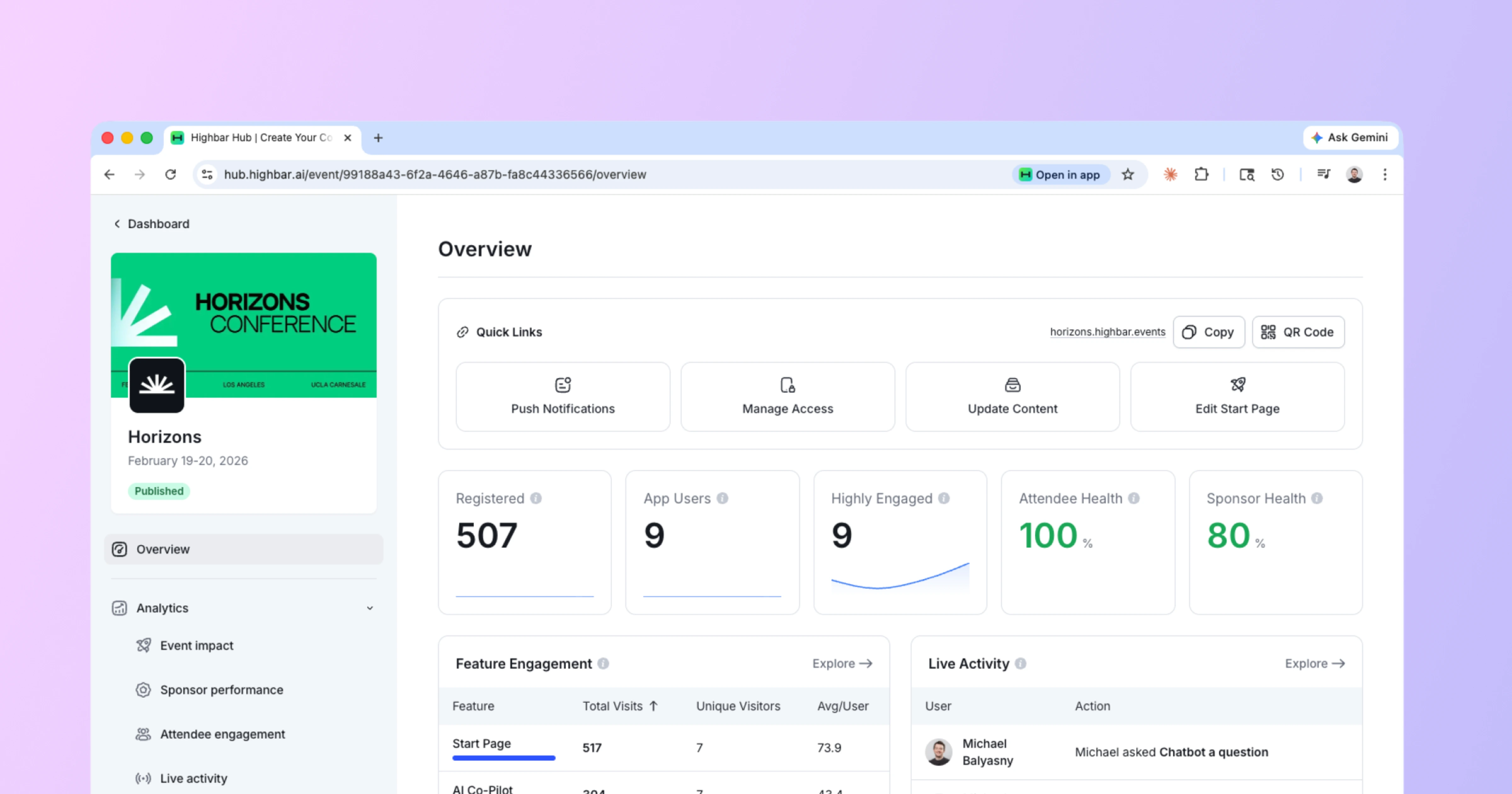 Most event apps are databases with a search bar on top. You scroll, you filter, you hope you find what you're looking for. Highbar flips that. The AI concierge is the interface. Ask it a question and it pulls from sessions, speakers, sponsors, maps, attendee profiles. It recommends, it connects, it follows up.