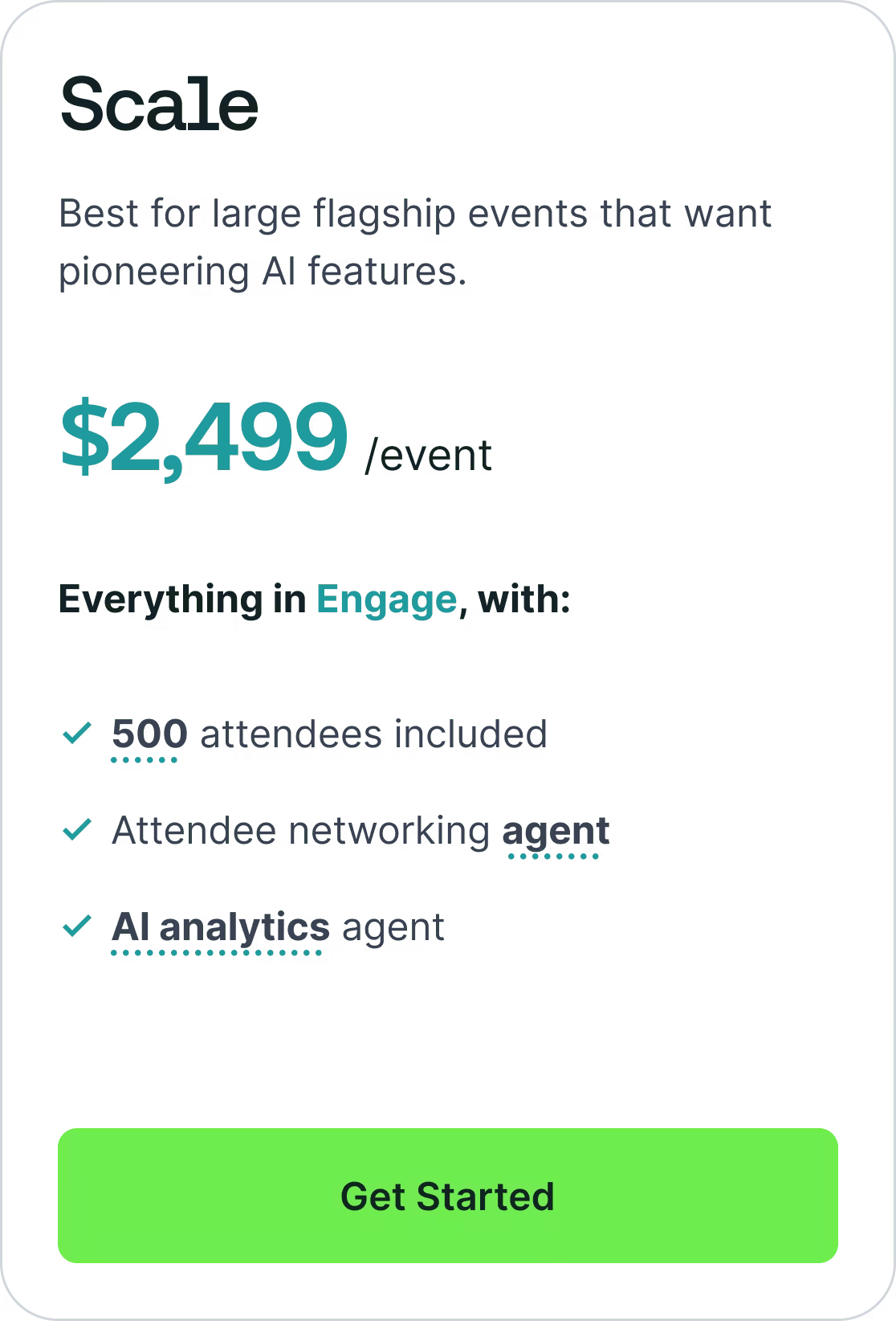 Eventmobi uses tiered pricing that scales based on the number of attendees, selected feature add-ons, and access to advanced modules and integrations, but many teams encounter: